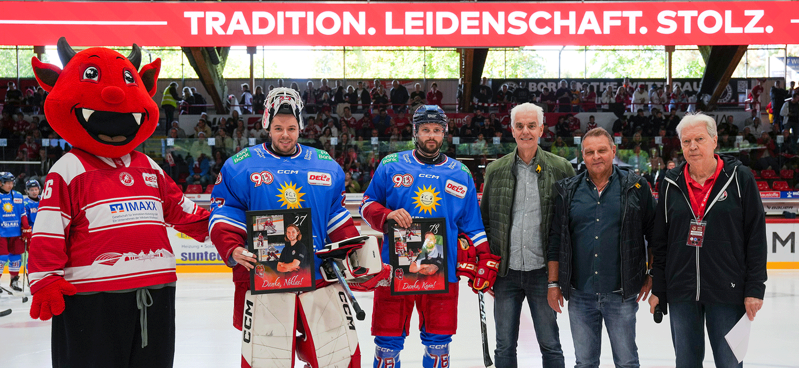 Applaus, Applaus: Den hatten sich Niklas Lunemann und Kevin Orendorz auch verdient. Da die beiden im Sommer von Bad Nauheim nach Düsseldorf gewechselt waren, hatte eine Verabschiedung noch nicht stattfinden können. Das wurde am Sonntag vor dem Spiel nachgeholt. Sympathien sind geblieben, das war deutlich zu hören. Der Keeper und der Stürmer bekamen jeweils eine Collage als eine Erinnerung an ihre Zeit im Trikot der Roten Teufel. Im Namen des EC und der Fans überreicht von den beiden Sprechern des Aufsichtsrates, Martin Schröer und Gerald Lauerer. Dazu gab es nette Worte von Stadionsprecher Richard Eberhard und eine herzliche Umarmung von Hellvis.