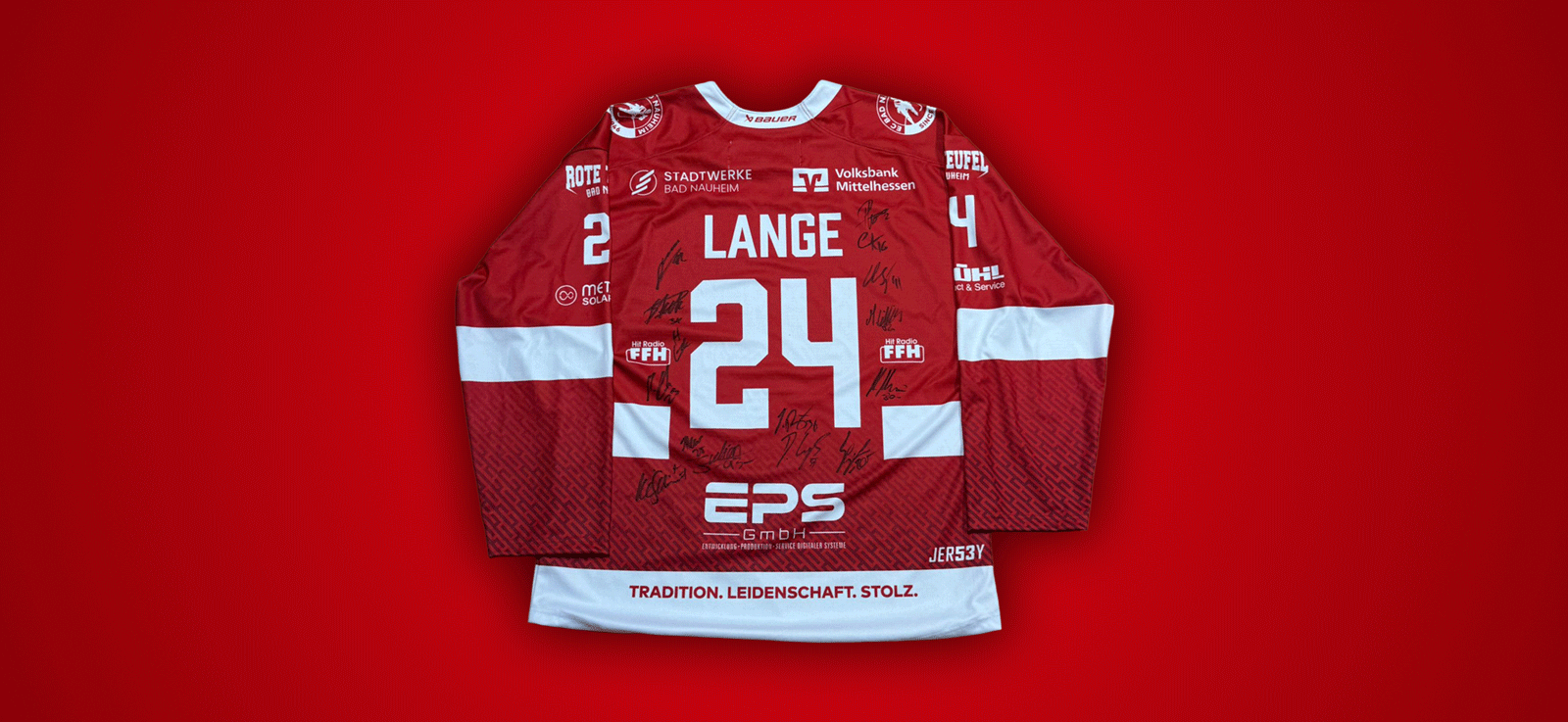 Drei schöne Preise: Schlappe 2 Euro kostet ein Los. Unser Förderverein „Teufelskreis“ bietet die Lose an. Die Preise: Ein Goldhelm, unterschrieben von Parker Bowles. Ein Torwart-Schläger von Jerry Kuhn, unterschrieben vom Team der Saison 25/26. Und schließlich ein besonderes Trikot aus der Spielzeit 2023/24. Die Rückennummer ist die 24, der Name „LANGE“ prangt auf dem Rücken. Das war lange Jahre die Rückennummer unseres Ex-Trainers Harry Lange. Unterschrieben ist das Jersey vom Kader aus der damaligen Saison. Die Gewinner werden von Headcoach Peter Russell nach der Präsentation der Mannschaft gezogen.