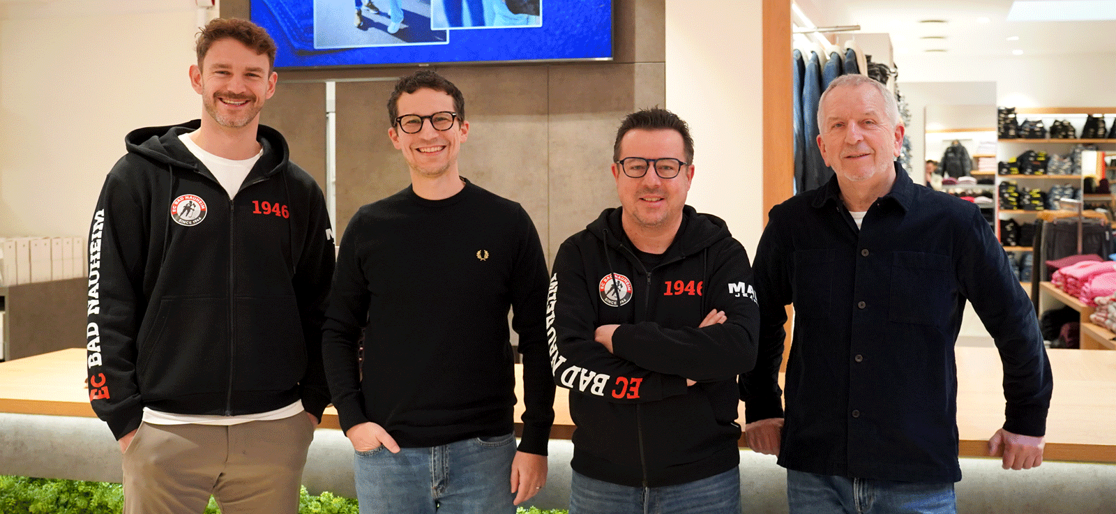 Auf unserem Bild zu sehen sind EC-Kapitän Marc El-Sayed, Dennis Unger (Geschäftsführer MAM JEANS), Christian Berger (EC-Kommentator) und Burkhard Unger (Geschäftsführer MAM JEANS)