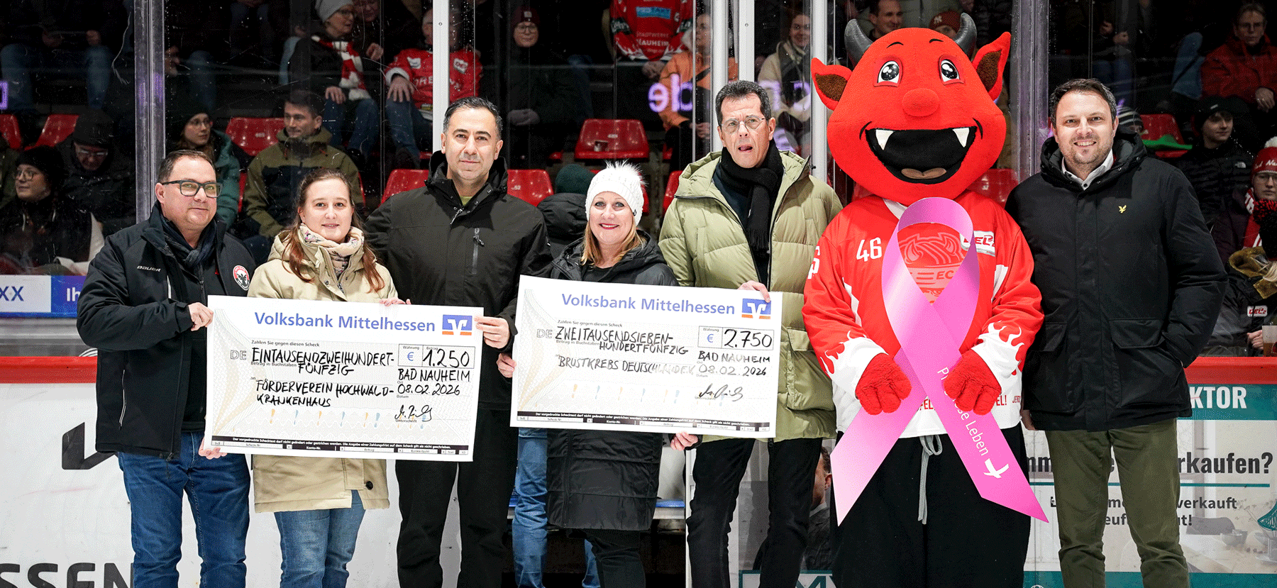 Auf unserem Foto (von links): Jörg Stangl (Geschäftsführer Gerhardt Bauzentrum & Vorstand Rote Engel), Carolin Homberger & David Medhoff (Brustzentrum Bad Nauheim), Kira Schäfer (Regionalvertretung von Brustkrebs Deutschland e.V. in Hessen), Michael Richly (Vorstand Rote Engel), Hellvis, Christopher Fiori (Geschäftsführer EC Bad Nauheim)