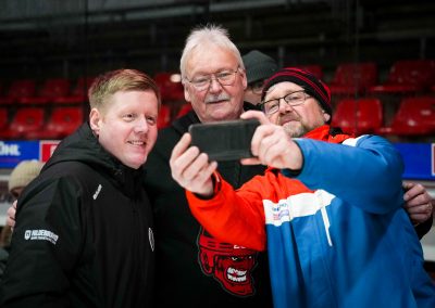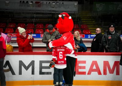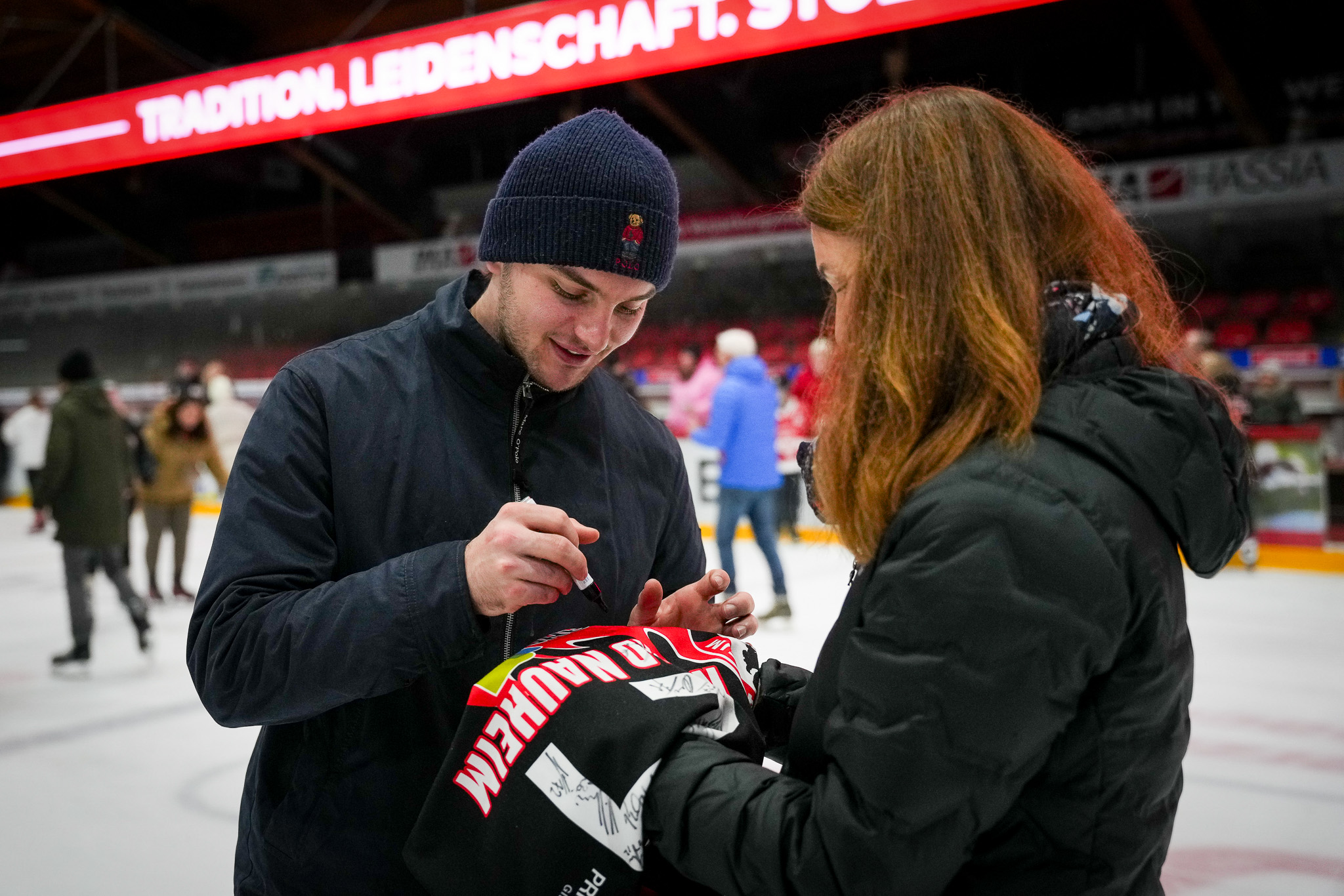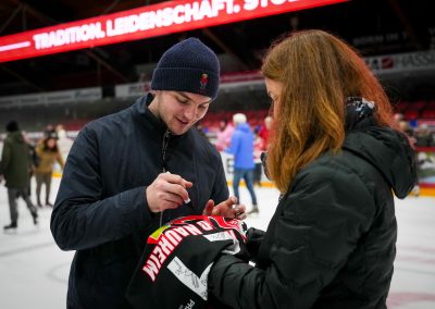 Schon lange vor dem Einlass um 17:30 Uhr bildete sich eine Schlange vor den Türen des CKS und als die Fans um 18:00 Uhr auf die Eisfläche durften, war sofort Leben in der Bude. Zwischen Begrüßungsworten von EC-Geschäftsführer Andreas Ortwein, fröhlichen Kinderstimmen und dem satten Schaben der Kufen wurden Autogramme geschrieben, Fotos gemacht und fleißig Hände geschüttelt. Die Jungs nahmen sich viel Zeit für Gespräche, ob am Rand der Bande oder mittendrin im Gewusel auf dem Eis.