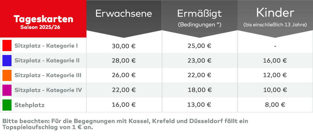 Als ermäßigt gelten Personen zwischen 14-17 Jahren, Schüler, Studenten, Auszubildende, Jugendfreiwilligen-/oder Bundesfreiwilligendienstleistende, freiwillige Wehrdienstleistende, FSJler, Rentner, Menschen mit Behinderung ab 50% GdB, Arbeitslose und Sozialhilfeempfänger mit einem jeweils entsprechend gültigen Ausweis, der am Stadion-Eingang in Verbindung mit der Eintrittskarte unaufgefordert dem Ordnungspersonal vorzuzeigen ist.